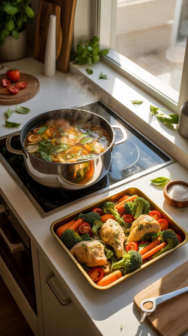 Steaming is another gentle method. It preserves nutrients and texture while taking very little active time, especially when you use a vegetable steamer basket or even the microwave. I sometimes steam broccoli or green beans in the microwave with a bit of water — it’s done in 3 to 5 minutes and requires barely any attention.
