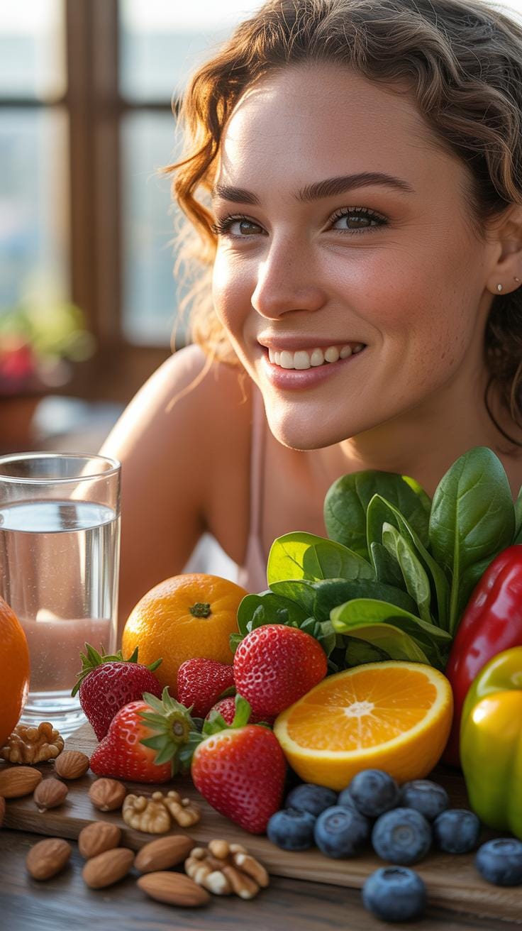 • Vitamin C from citrus fruits or strawberries, supporting collagen and skin repair.