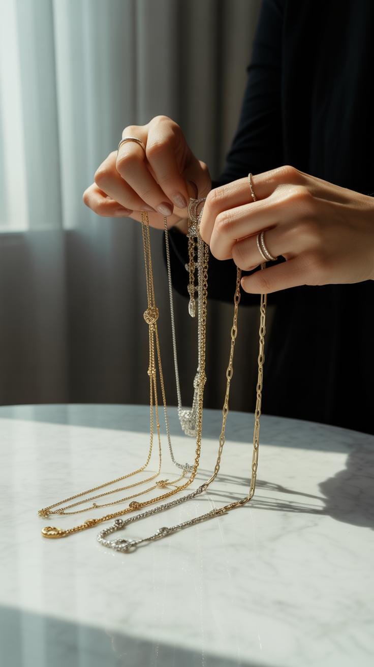 This spacing lets each piece shine on its own but still works as a coordinated look. Yet, sometimes the difference in length isn’t enough—you might still catch chains twisting together. In those cases, playing with necklace weight or chain style can help too.